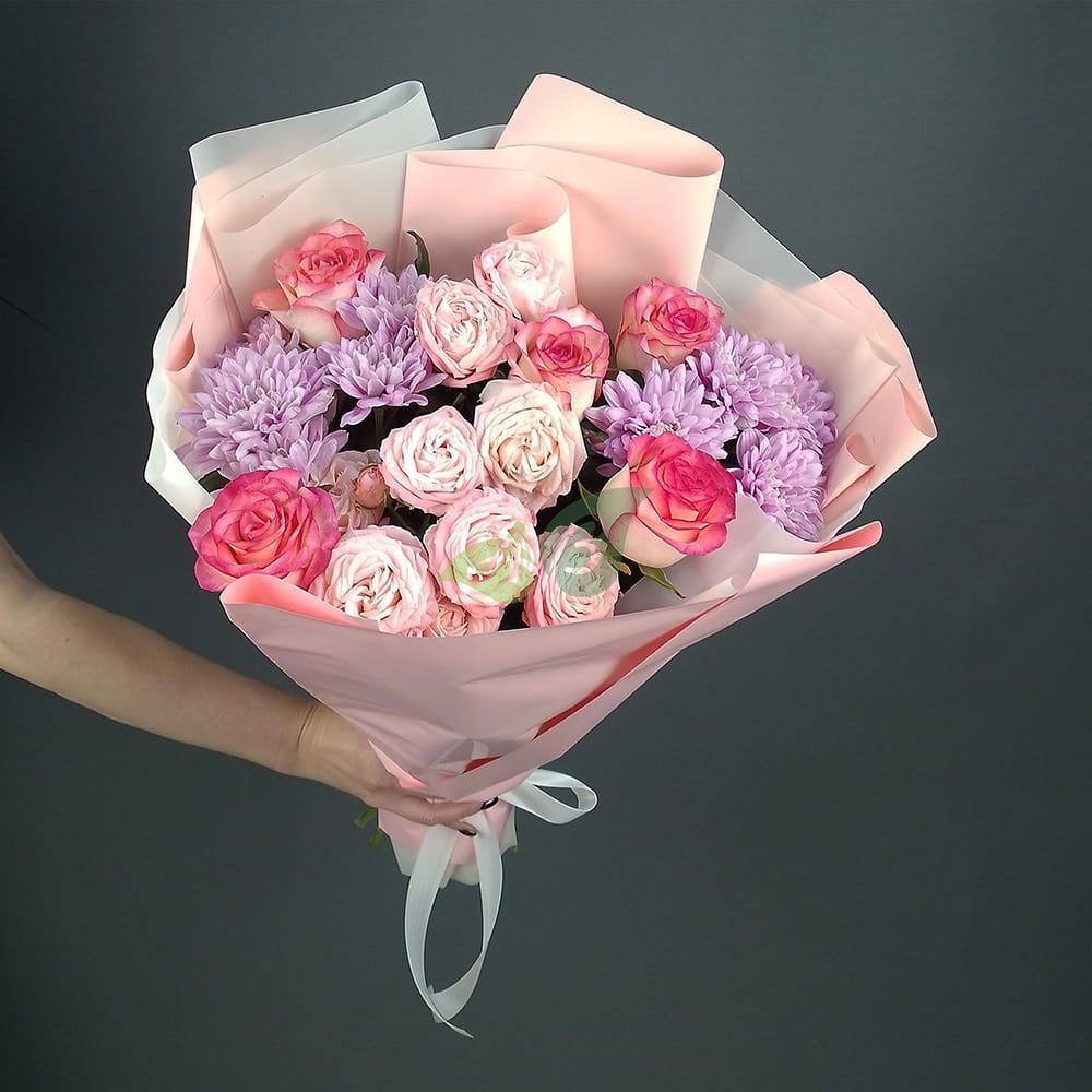 Состав и характеристики букета из кустовых роз и хризантем "Тёплые объятия":